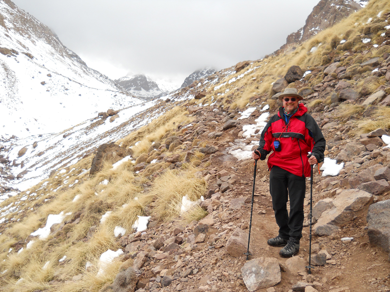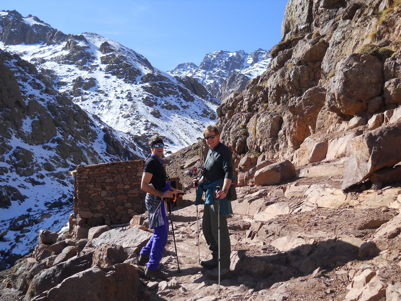 Sunday dawns cloudy and there’s snow in the air. We have a leisurely breakfast. Some of our number take a wander up to the head of the valley above the refuge. By midday we’re heading back to rendezvous with our Muleteers and those trusty Mules. Walking down is so easy when you’ve spent a few days high up and we’re soon offloading the sacks and back to our routine of stopping for that lovely fresh orange and then the mint tea at Sidi.