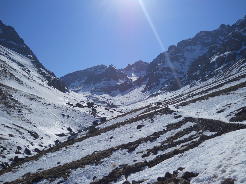 Crossing the Glacial plain, surrounded by moraines, as we head out of Armed, we start to climb again towards the Sidi Charamouch (2350m). This is an important pilgrimage site for Muslims and it offers refreshments en-route to the refuge’s. Stopping for a break at Sidi we’re offered Mint Tea (not free I hasten to add). This is a sweet tasting and refreshing drink which definitely touches the spot for the thirsty mountaineer.